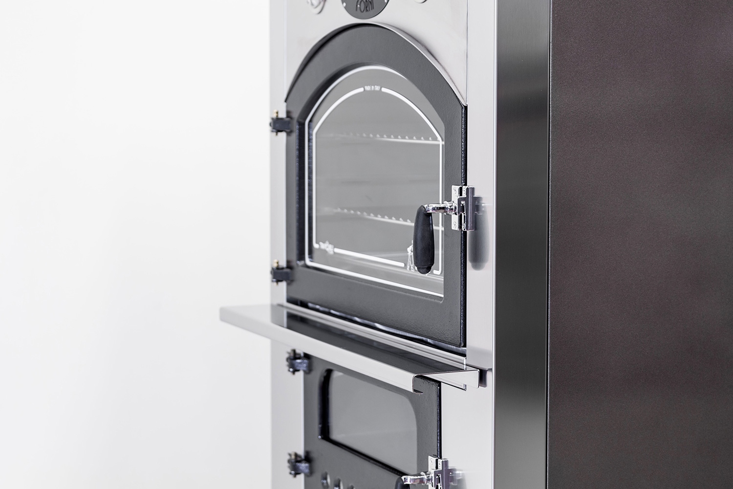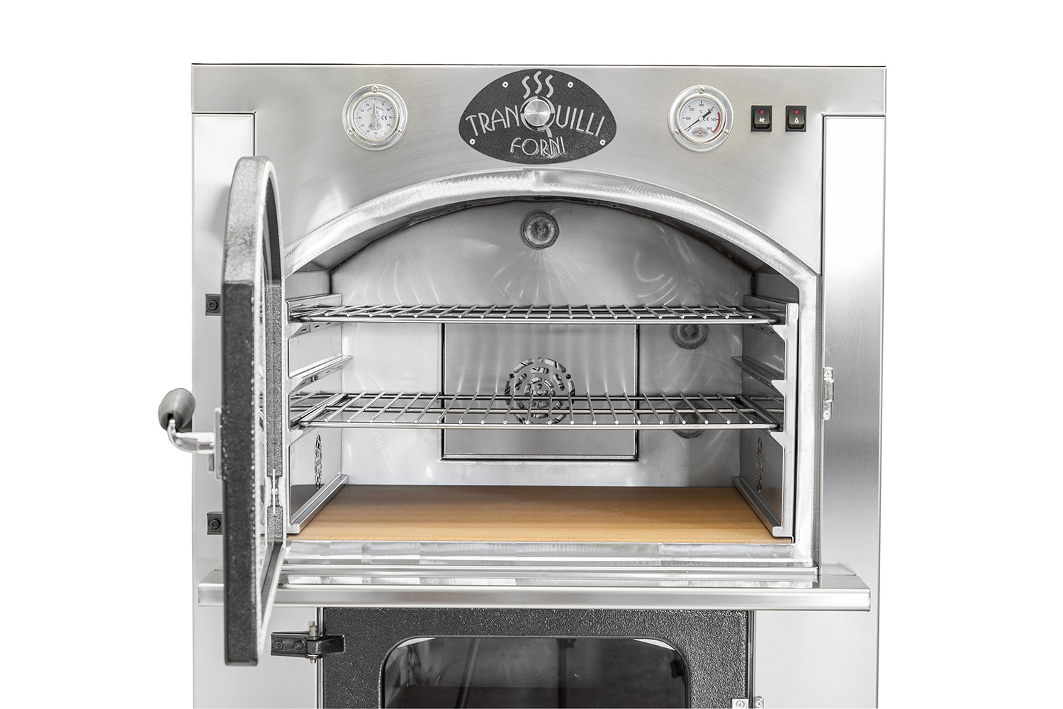 It is the largest oven in the Tranquilli Forni range in the built-in version with stainless steel front suitable for large modern, rustic, and tavern kitchens in the version with black and copper-colored doors! The built-in Giove Inox model comes in three depth sizes of 60/80/100 for the cooking chamber.