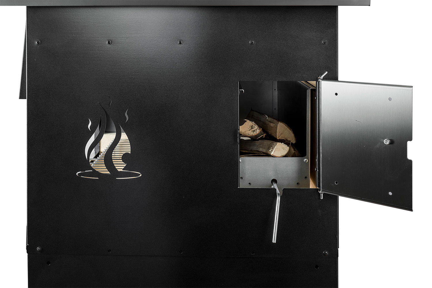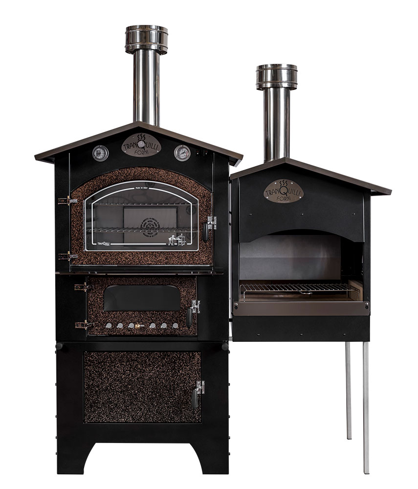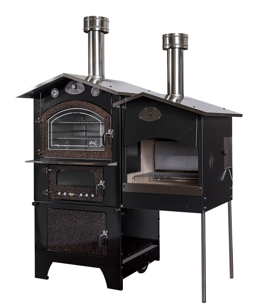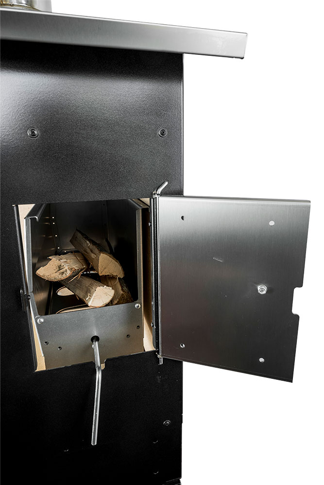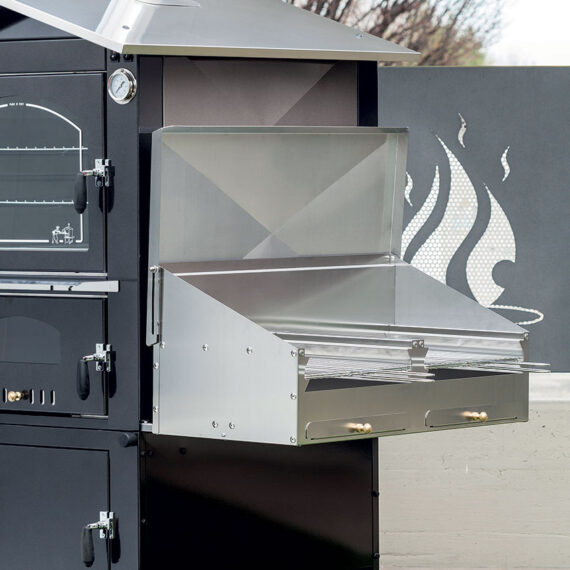 Wood-fired barbecue combinable with our front cooking ovens, made of liquid-painted aluminum sheet. It features a door to load wood into the wood holder equipped with a log cutter, and a grill measuring 32 x 60 cm.
