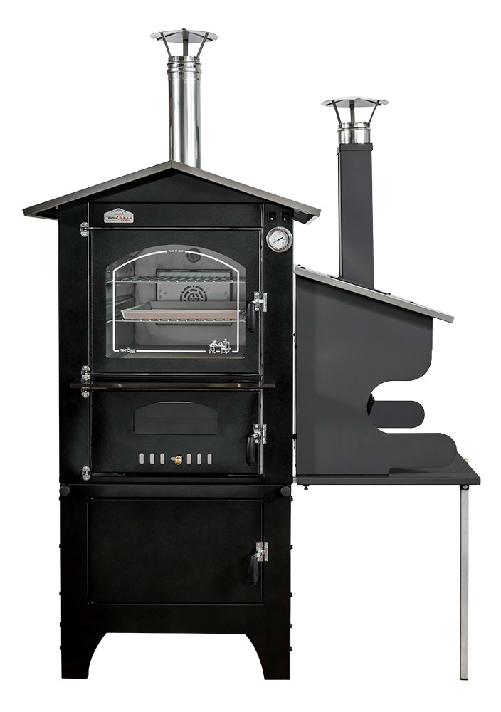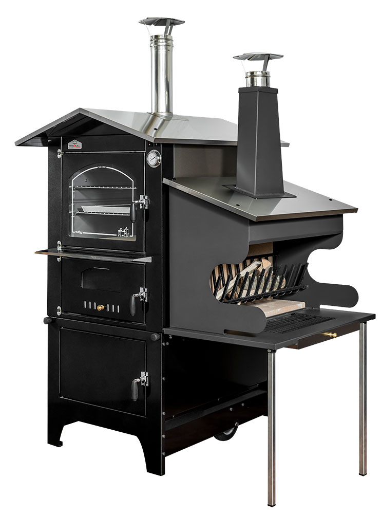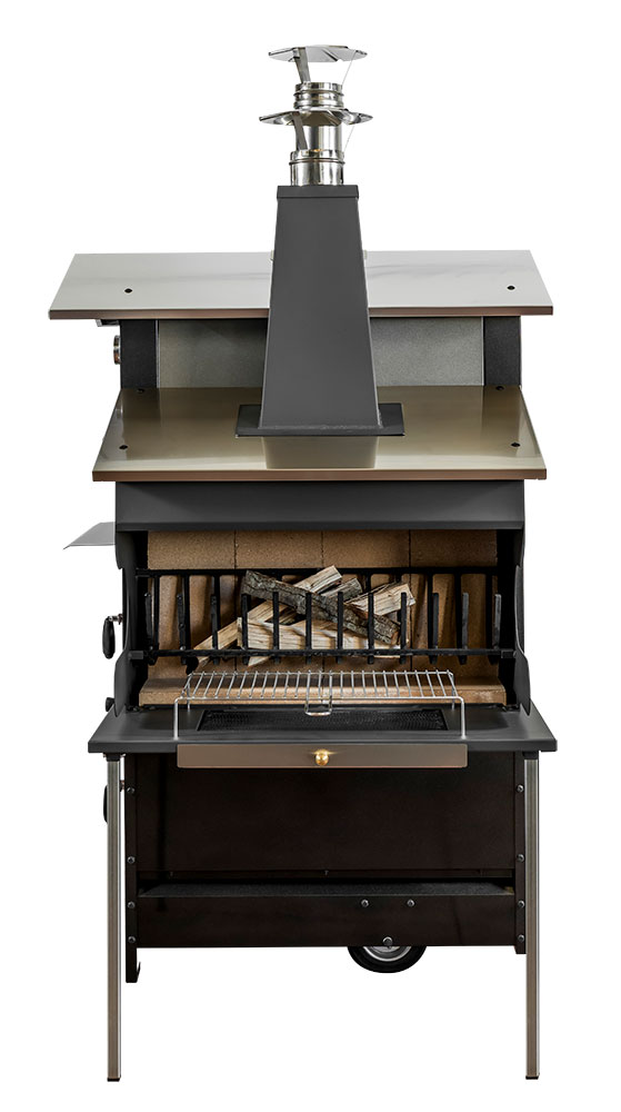 Wood-fired barbecue combinable with our ovens with side kitchen, made of liquid-painted aluminum sheet. It features a door to load wood into the wood holder equipped with a log cutter, and a grill measuring 32 x 60 cm.
